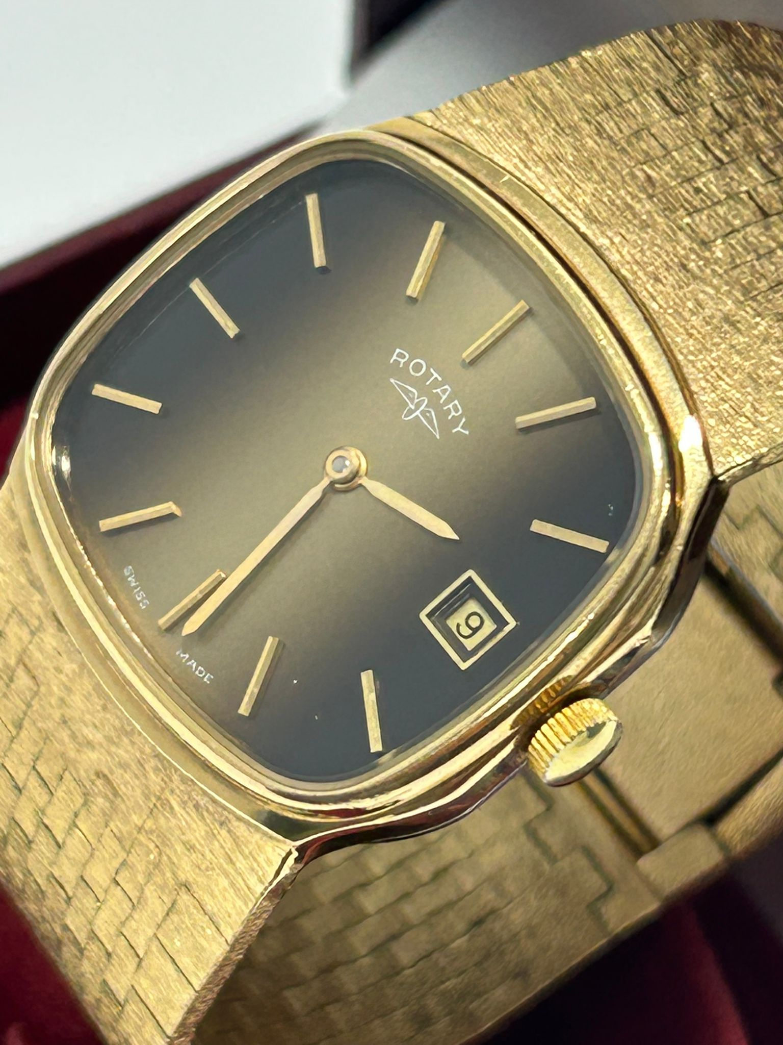 Rotary Tiger Eye Vintage Rectangular Dress Watch – Gold Plated Case, Manual Wind, Date, Box & Papers